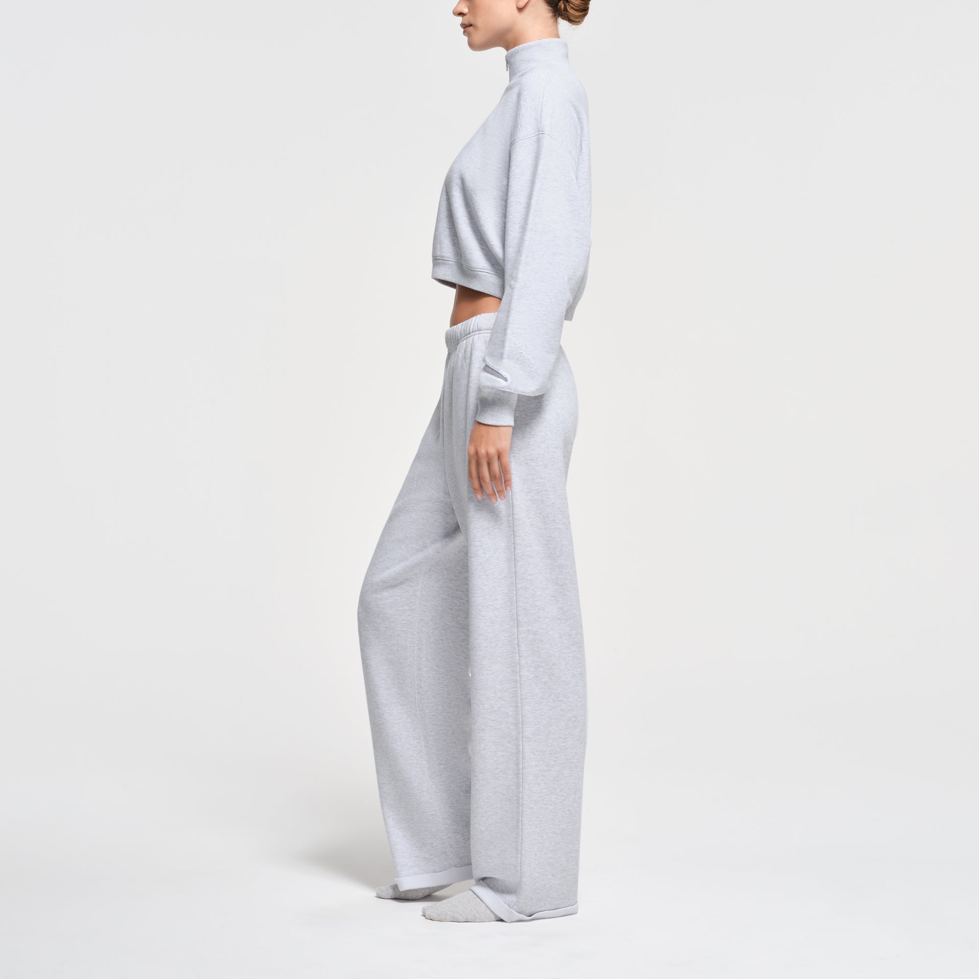 Feel as good as you look. This cropped pullover has a soft, cloud-like feel and classic fit. Easy to throw on and wear with bottoms, it features a mock neck, 3/4 front zipper, and drop shoulder. Ribbed details elevate the neck, cuff, and hem. Fits true to size.