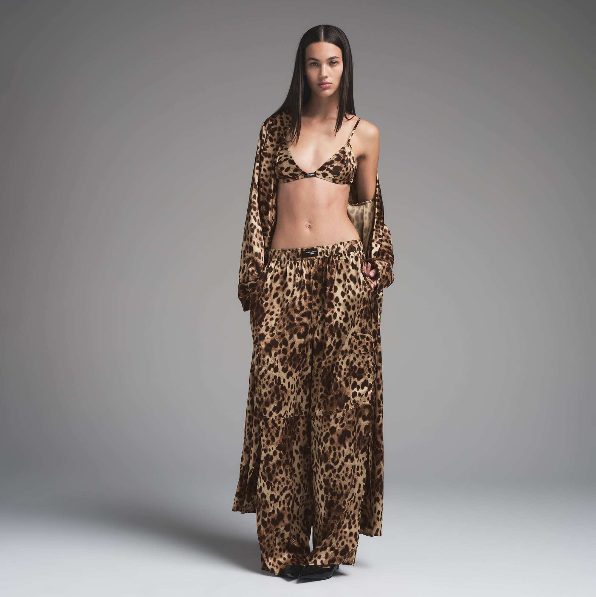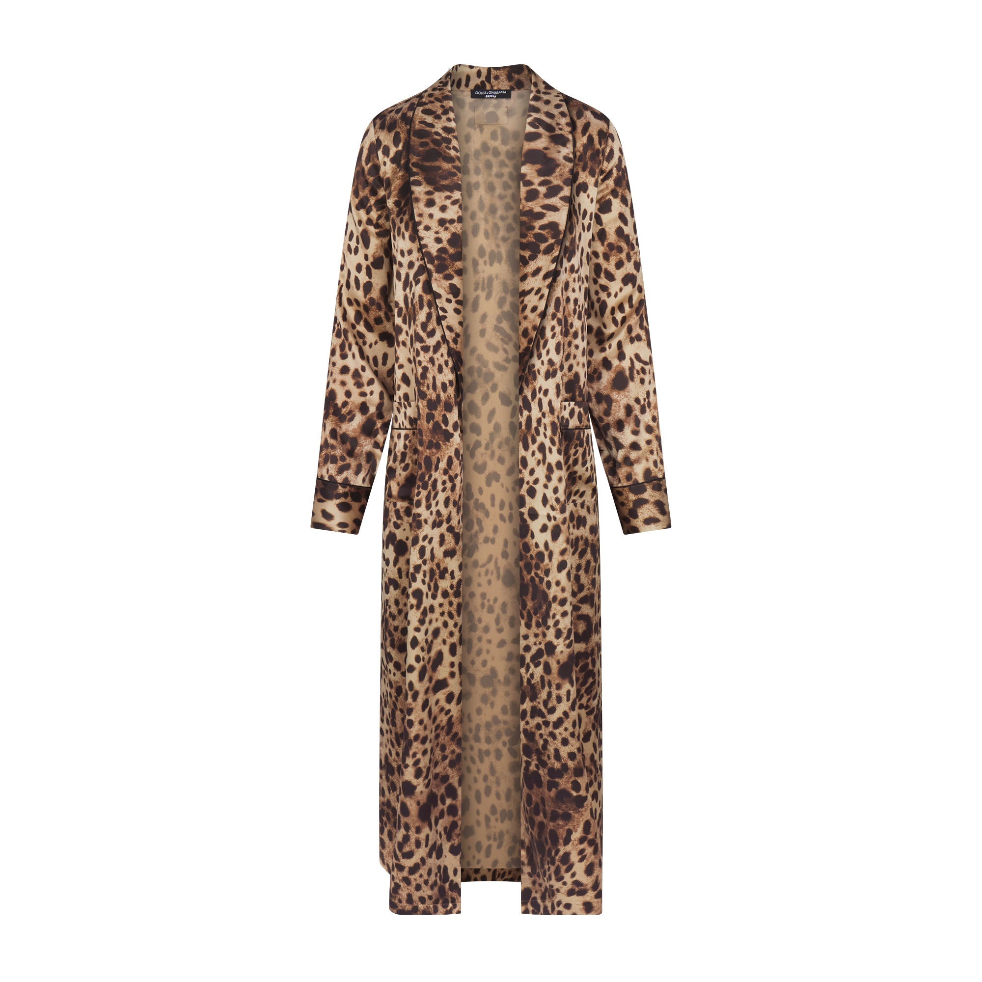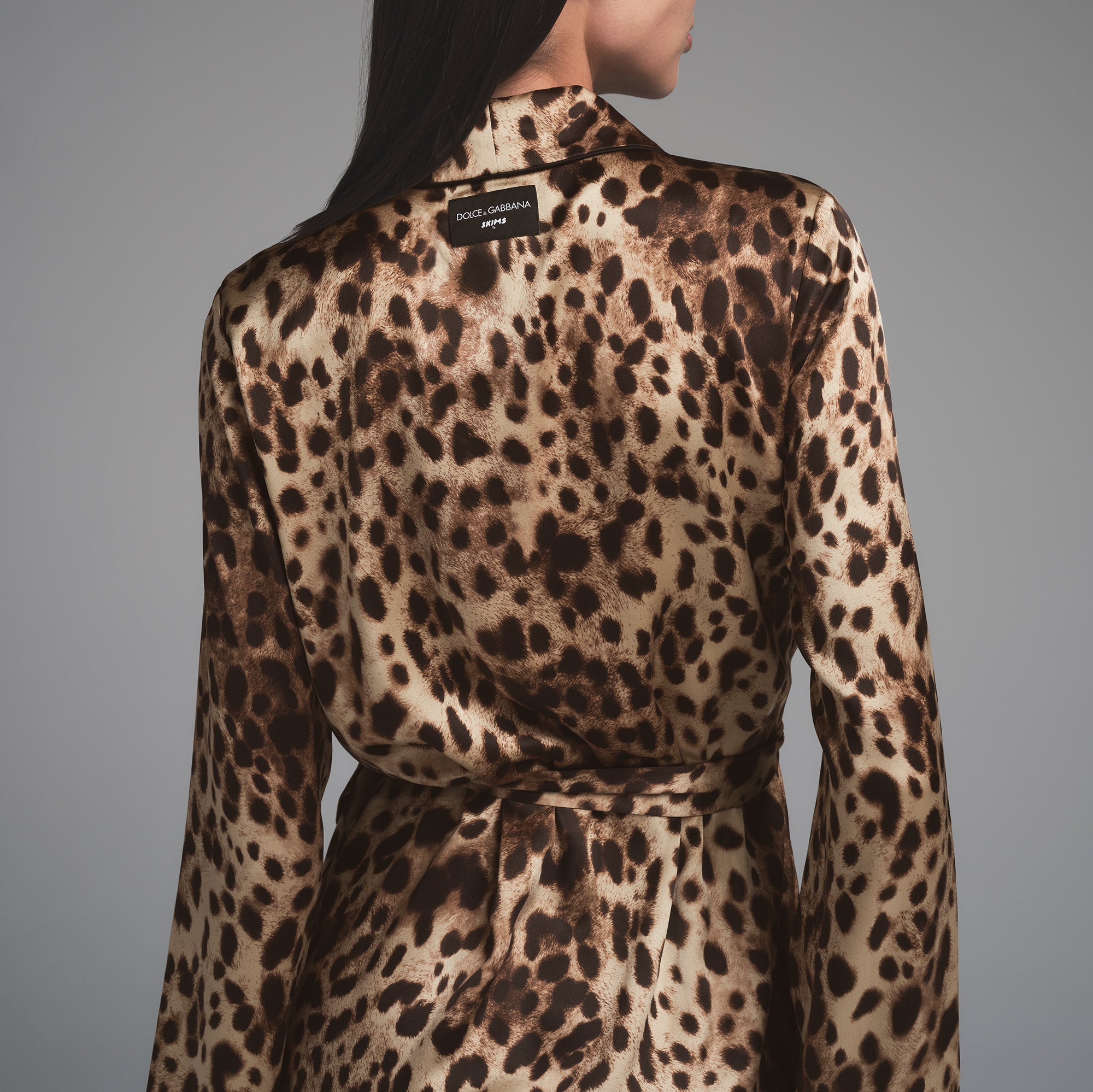 Wrap yourself in silky charm. This lightweight robe makes waking up and winding down feel fascinating with Dolce&Gabbana’s iconic Leopard print. Thoughtfully detailed with two front pockets, a removable tie, and a statement logo detail at the back collar. Part of the limited edition Dolce&Gabbana x SKIMS Collection.