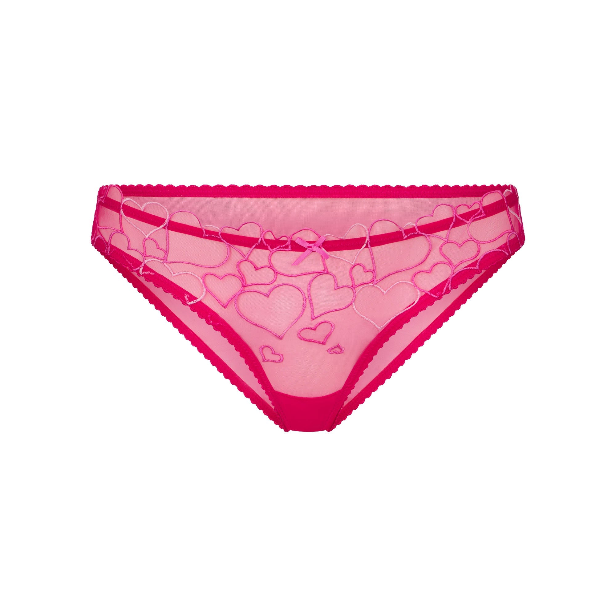 Sweet temptation. Made with our sultry, sheer tulle, this medium coverage bikini features ultra-girly heart embroidery and dainty picot elastic. Includes a satin bow center detail and 100% cotton gusset. Fits true to size.