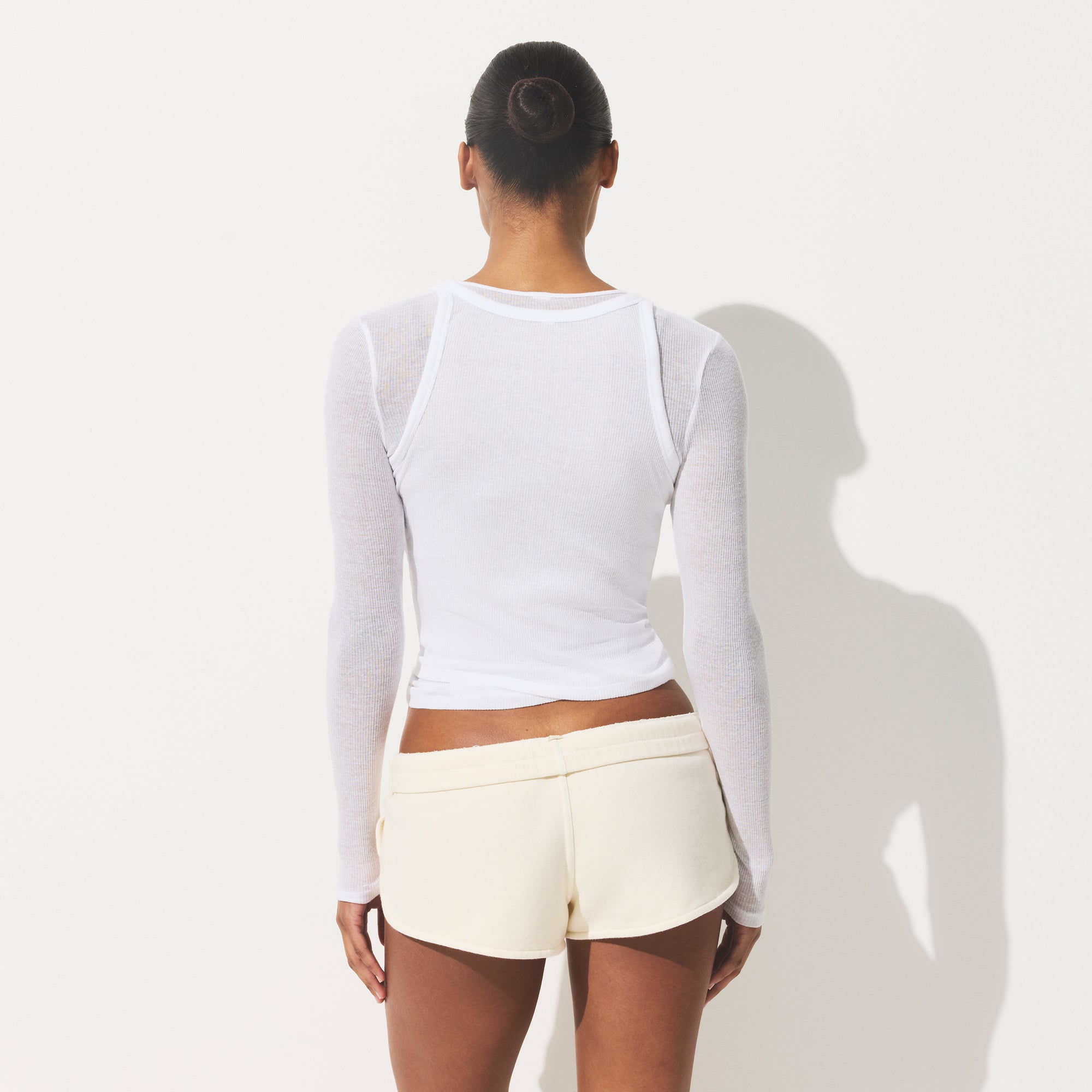 The sexiest tank ever. Designed in our sheer ribbed cotton, this airy top is the sexiest layer you’ll have in your closet. Features a crew neckline with cutaways at the arms. Fits true to size.