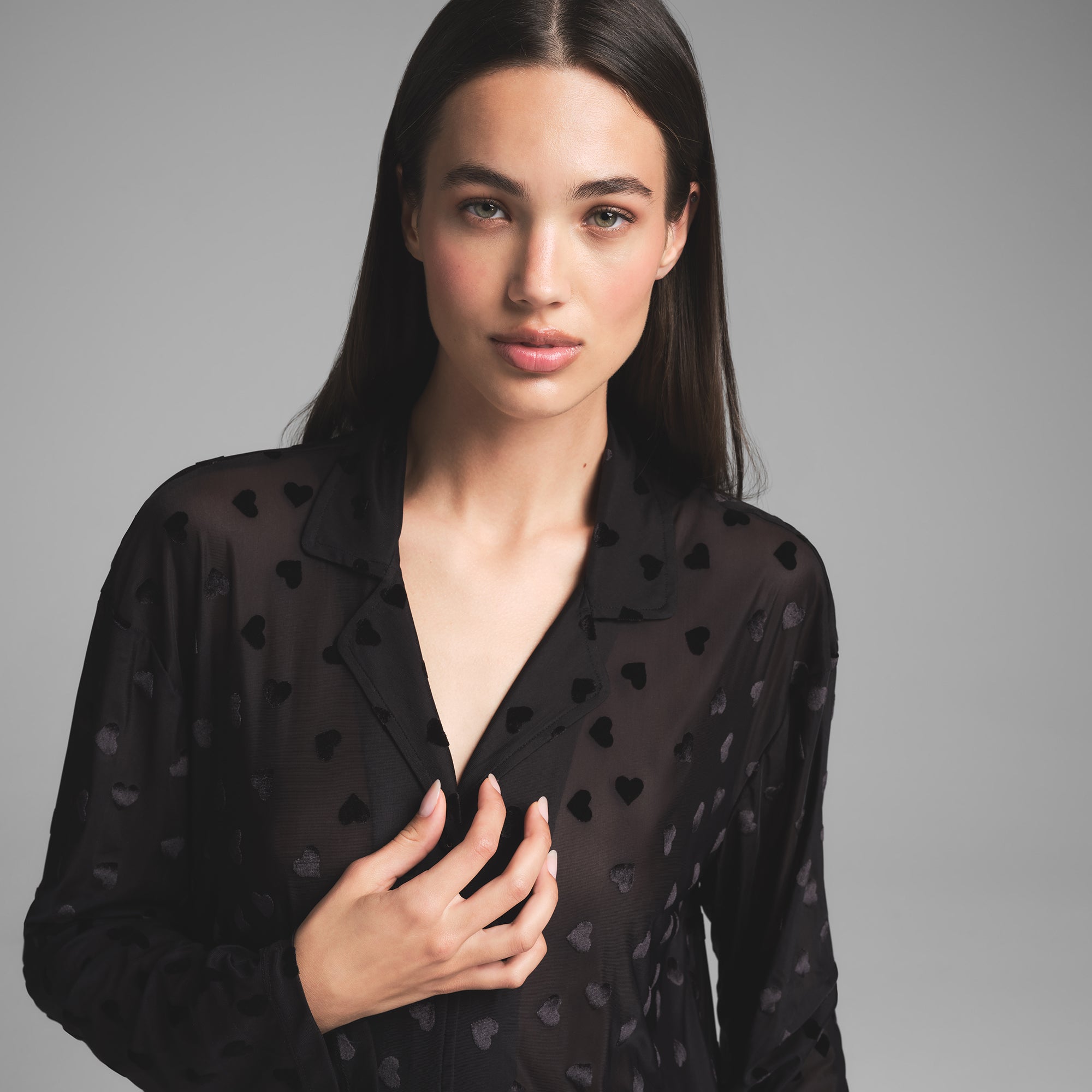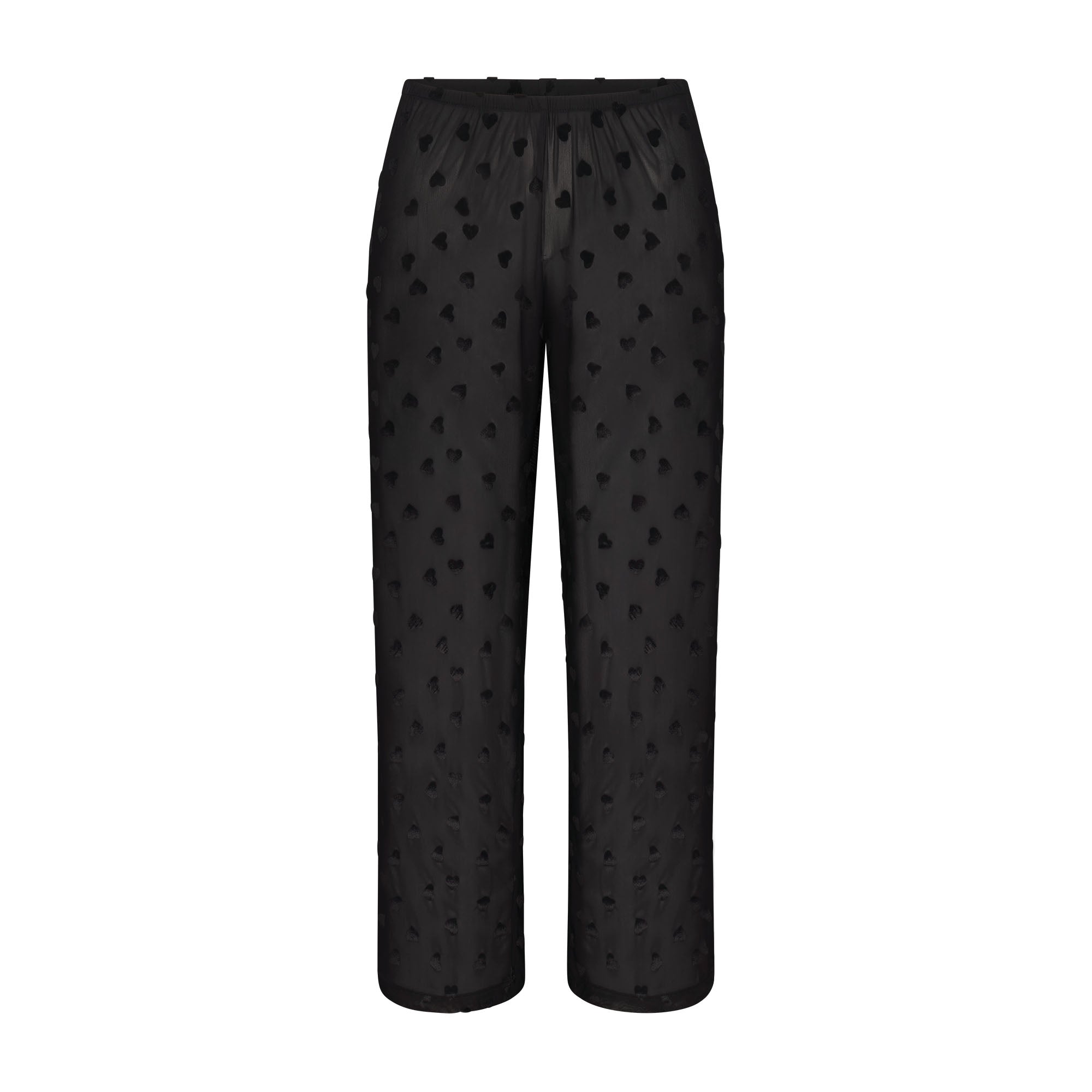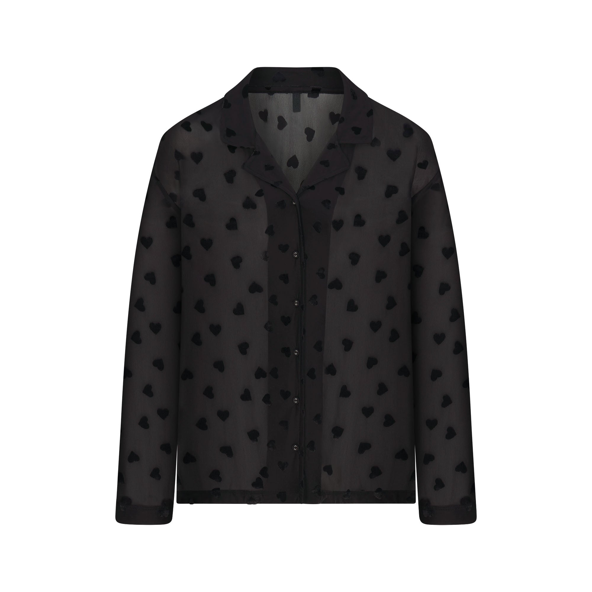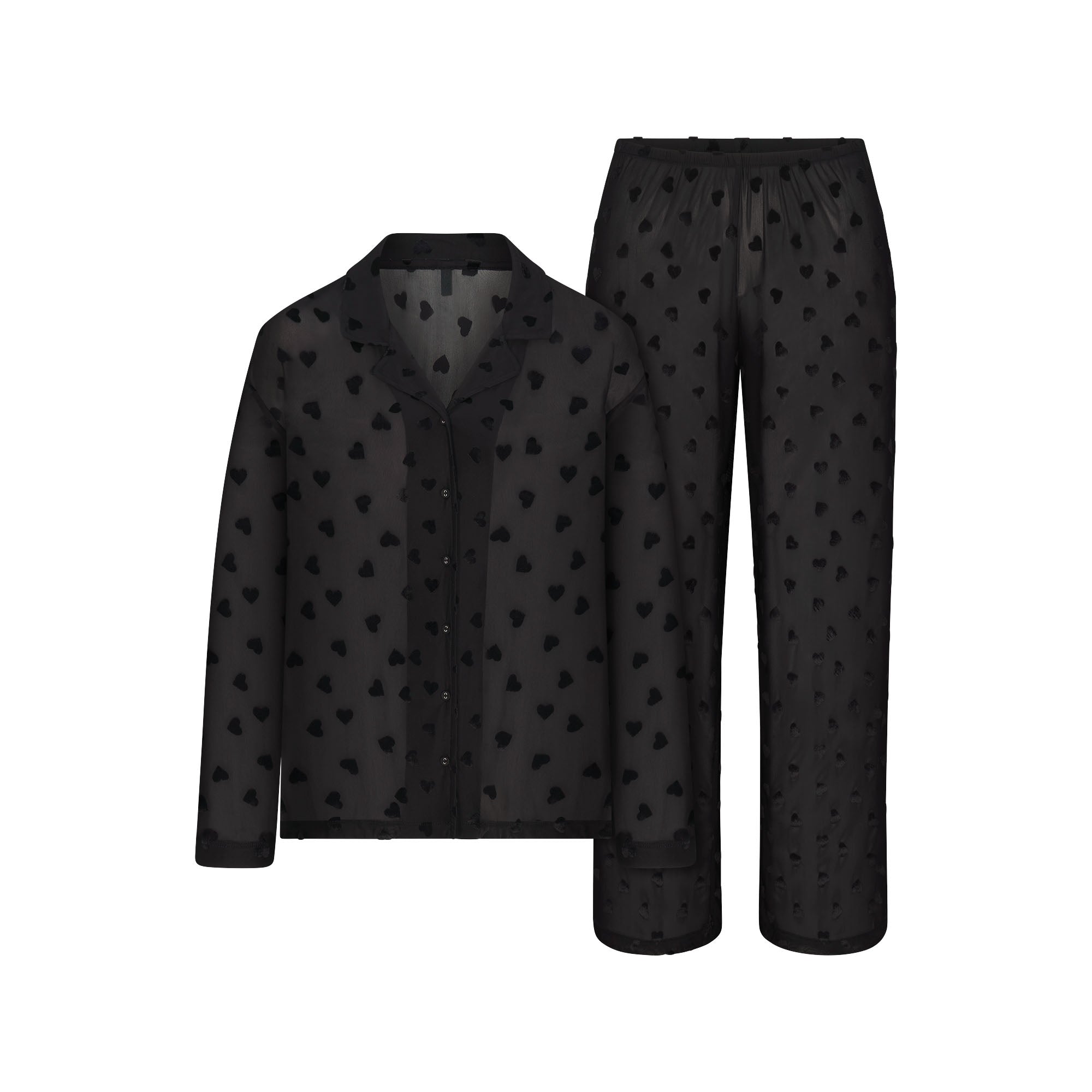 Sheer, sexy, irresistible. Made of a sheer, ultra-smooth fabric for your most comfortable rest, this duo is covered in a sweet, repeating velvet heart print. The set includes a breathable long sleeve button-up and relaxed straight leg pants with an elastic waistband.