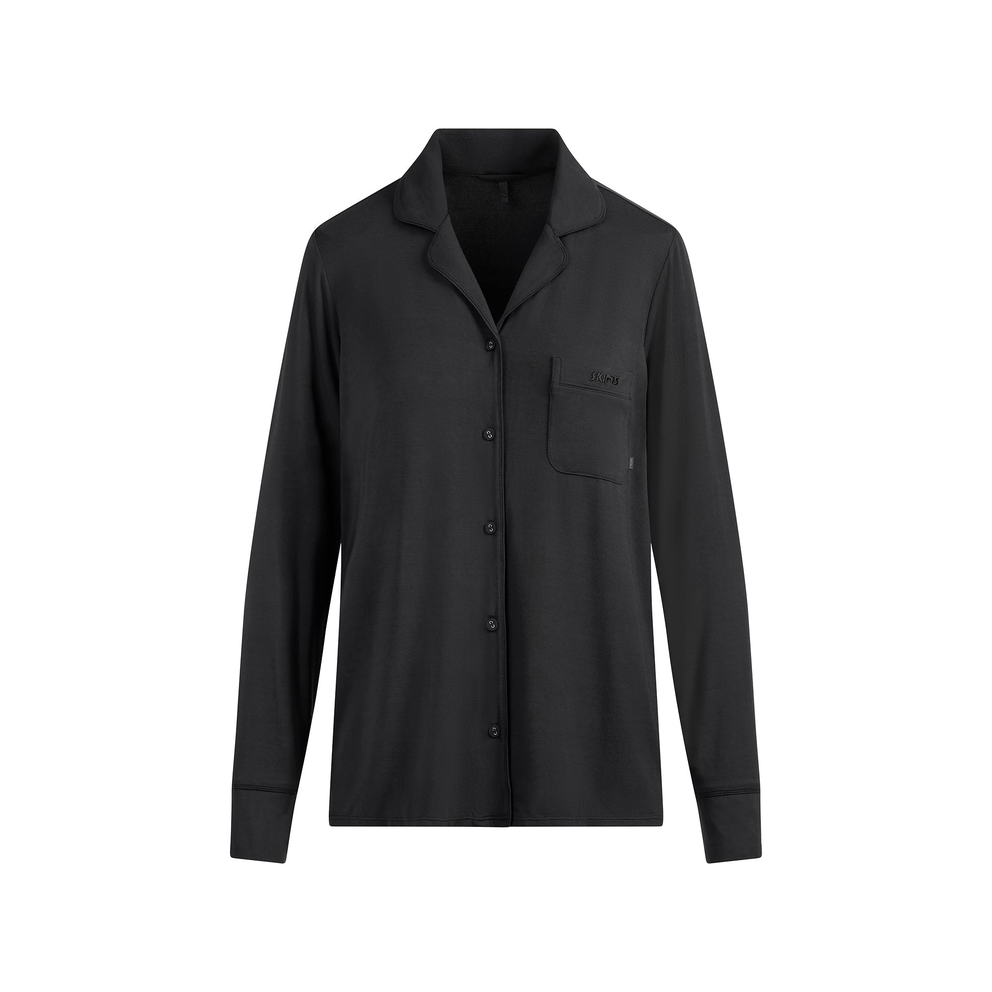 Your old pajamas can’t compete with this soft, ultra-comfortable sleep set. Features a slightly oversized button-up top with long sleeves, a chest pocket, and piping details. The straight leg pants have a relaxed fit and a stretchy waistband with an adjustable interior drawstring. Fits true to size.