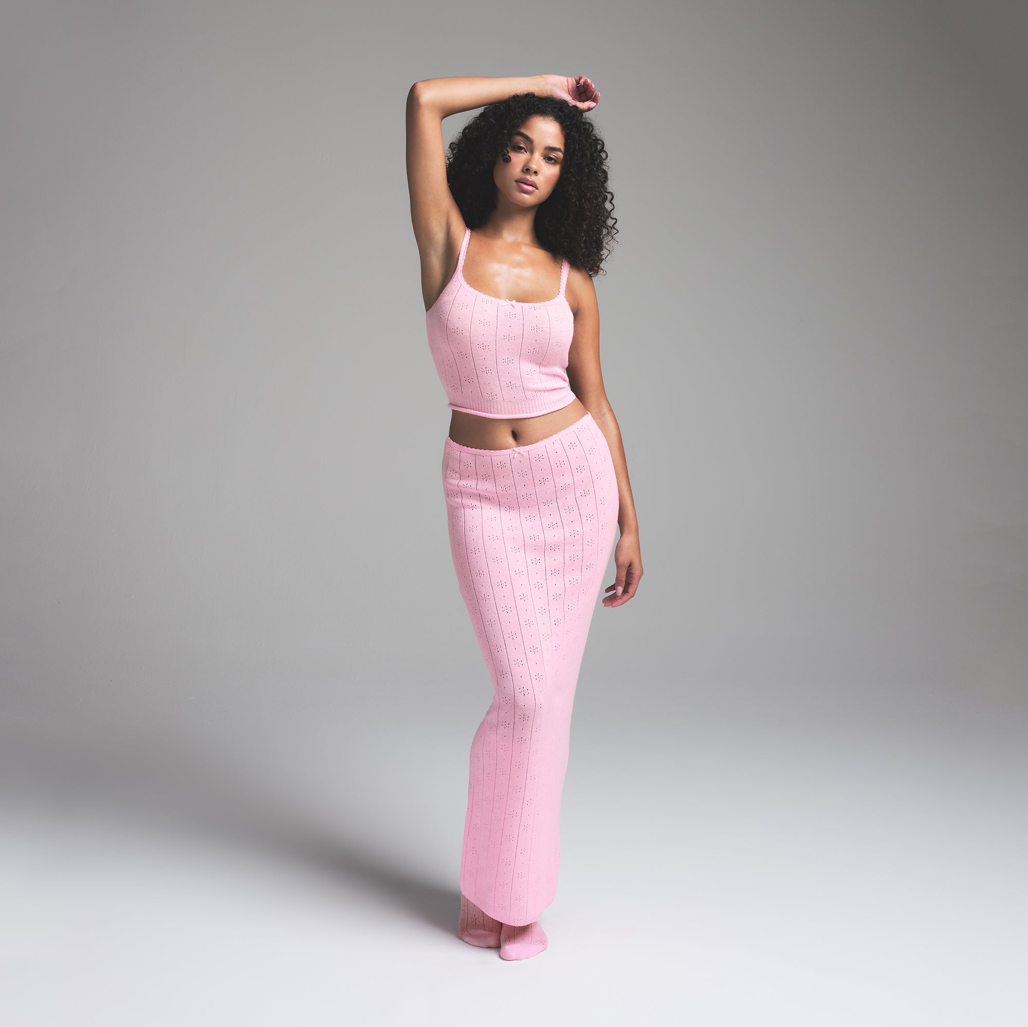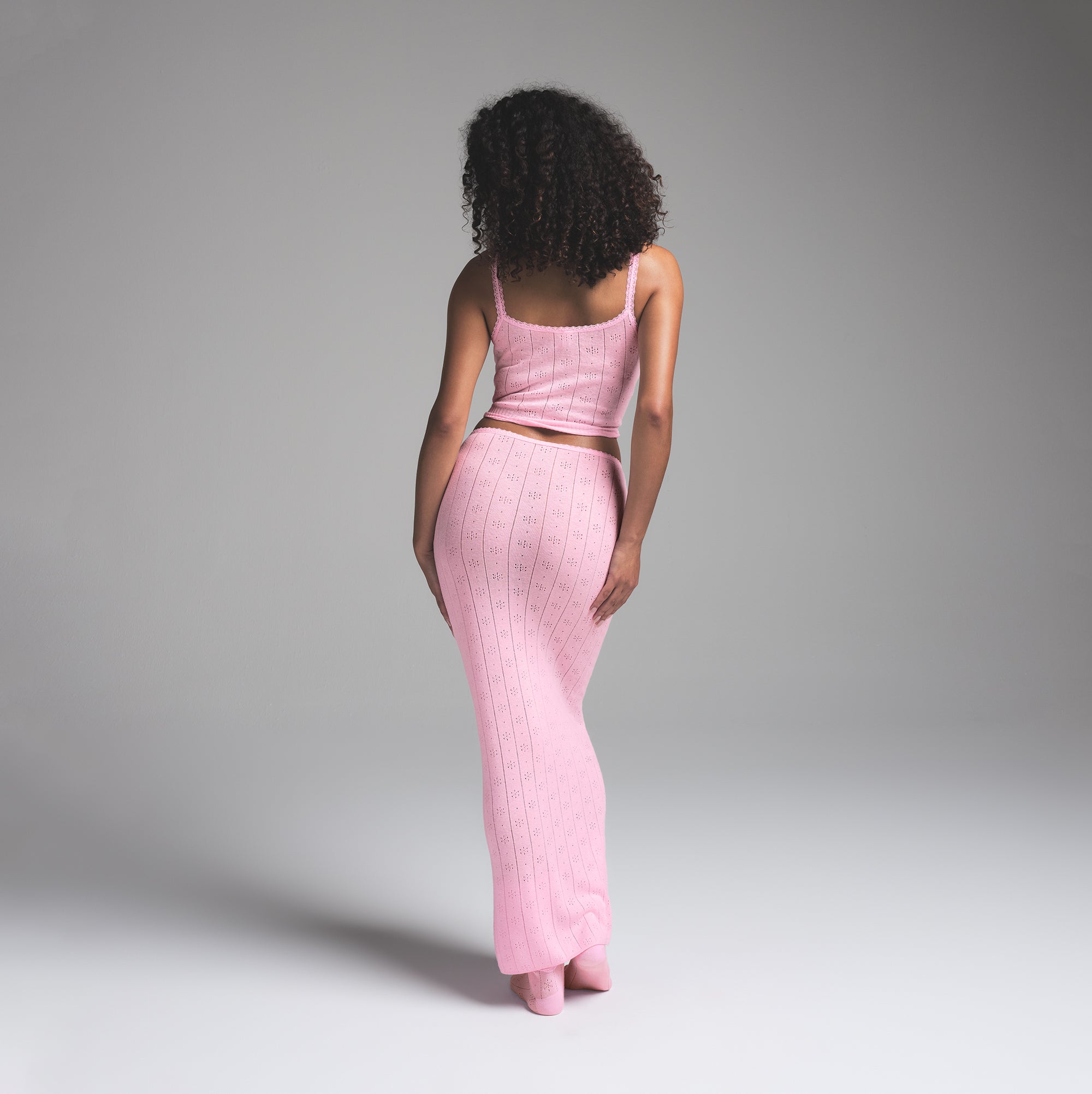 Warm up your winter wardrobe. This stretchy, ankle-length skirt stands out for its semi-sheer snowflake knit. Perfect for chillier days, this feminine style lets you take on the cold in comfort. Features a touch of lace at the waist and a mid-rise fit. It’s a major match for our Sweater Pointelle Cami.